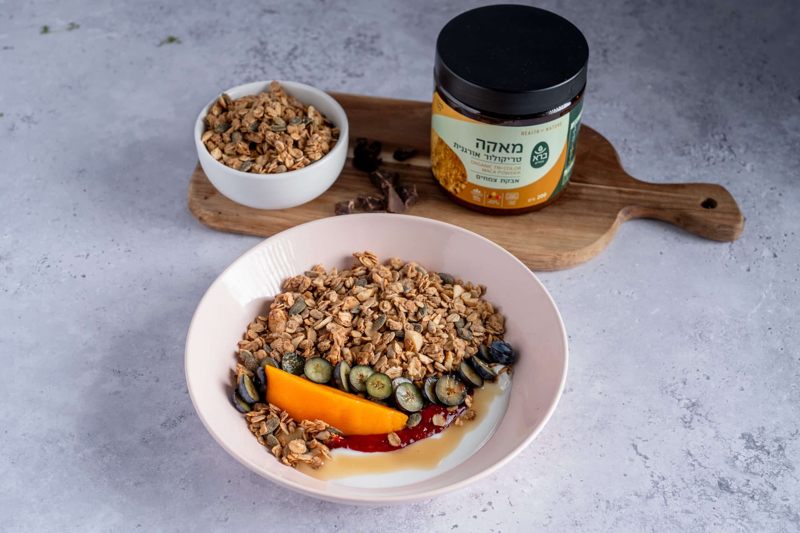 גרנולה מאקה עם יוגורט קוקוס וקונפיטורת מנגו אוכמניות – מתכוני השף