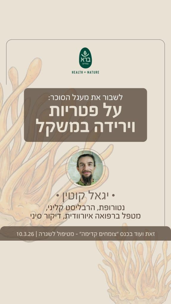 יגאל קוטין, נטורופת, ייגע באחד הנושאים הרגישים: תנגודת לאינסולין ושומן בטני. בהרצאה פרקטית וחדה הוא יראה איך אפשר להפוך תהליכים כמו צום לסירוגין ותזונה דלת פחמימות ליעילים יותר – בעזרת פטריות מרפא.
