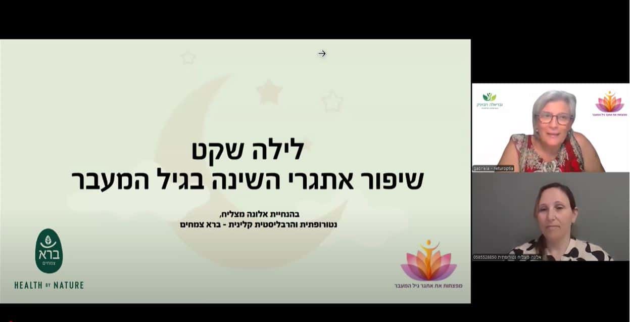 אלונה מצליח, נטורופתית והרבליסטית קלינית בברא צמחים, התארחה בוובינר של קהילת "מפצחות את אתגר גיל המעבר" בהנחיית גבריאלה חבויניק, ושיתפה מניסיונה בדרכי התמודדות טבעיות עם אחד האתגרים השכיחים ביותר בגיל המעבר – הפרעות שינה. נשים רבות נרדמות בקלות אך מתעוררות באמצע הלילה ולא מצליחות לשוב לישון – תופעה שמחמירה כאשר מתלווים אליה גלי חום, מחשבות טורדניות או תחושת מתח פנימית.