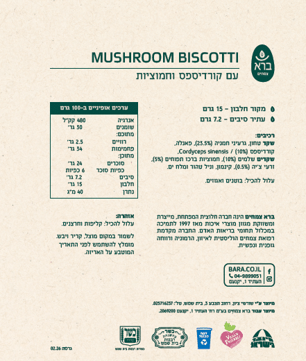 עוגיות ביסקוטי מפנקות, ללא קמח, עתירות בסיבים, המבוססות על שקדים טחונים , בארומה של קינמון ווניל. בשילוב הרמוני עם פטריות מרפא נבחרות, פירות יבשים, גרעיני חמנייה וזרעי צ'יה, התורמים תוספת סיבים תזונתיים, וכל אלה עטופים במתיקות מעודנת ומאוזנת, ממקורות טבעיים.