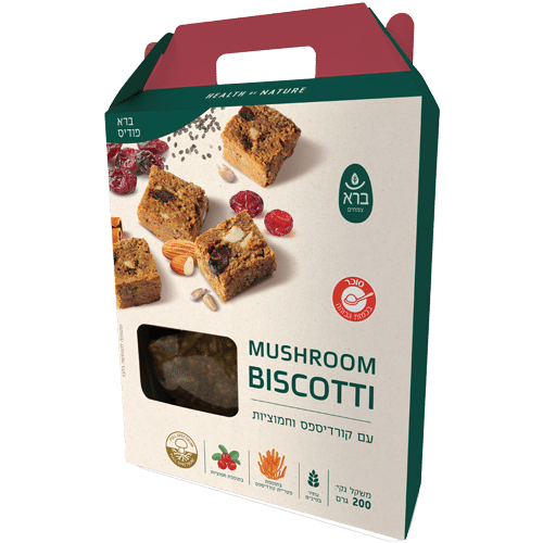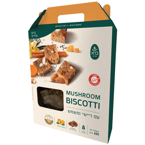 עוגיות ביסקוטי מפנקות, המבוססות על שקדים טחונים, בארומה של קינמון ווניל. בשילוב הרמוני עם פטריות מרפא נבחרות, דובדבנים יבשים, גרעיני חמנייה וזרעי צ'יה, התורמים תוספת סיבים תזונתיים וכל אלה עטופים במתיקות מעודנת ומאוזנת, ממקורות טבעיים.
