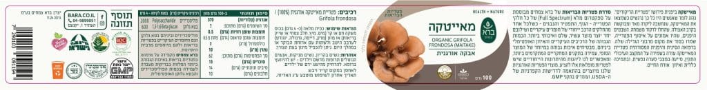 אבקת פטריית מאייטקה אורגנית, מספקטרום מלא – FULL SPECTRUM המכילה את כל חלקי הפטרייה, התפטיר, גוף הפרי, הנבגים והתרכובת החוץ תאית שהפטרייה מייצרת ומפרישה מחוץ לתא לסביבתה, לטווח פעילות אופטימלי.