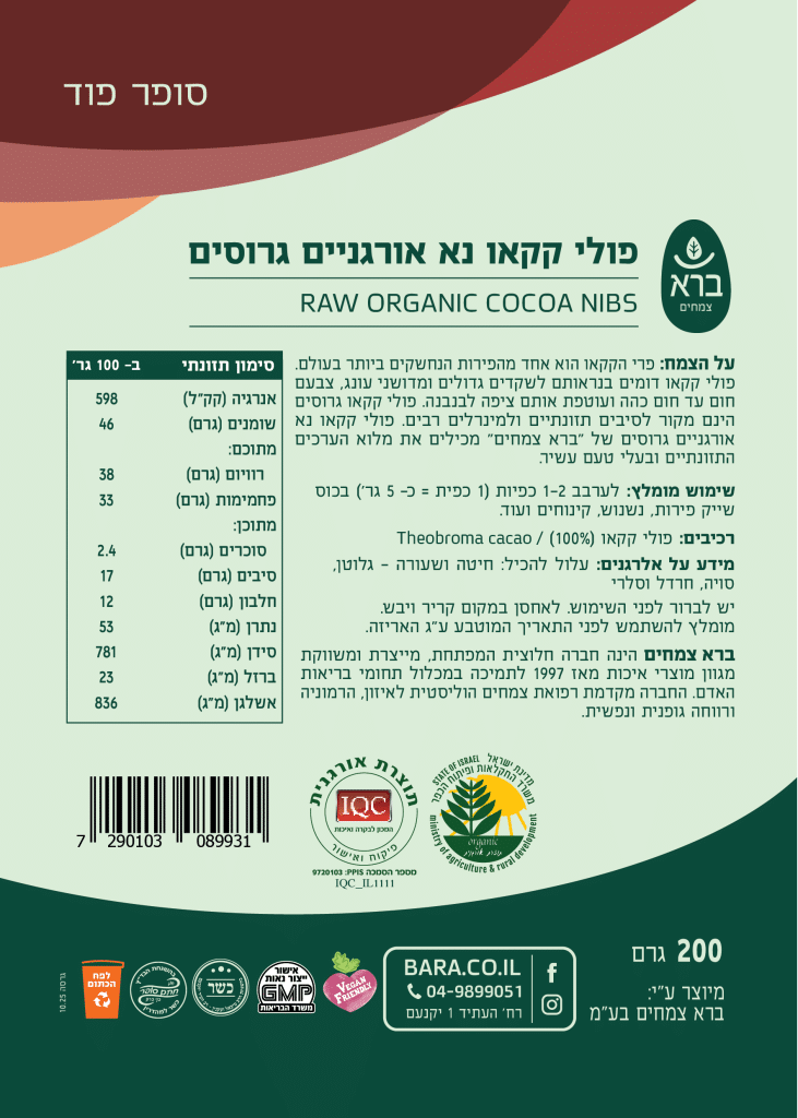 קקאו נא אורגני פולים גרוסים | RAW ORGANIC COCOA NIBS