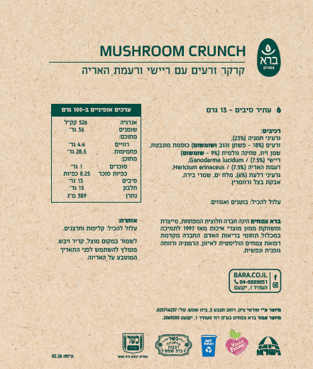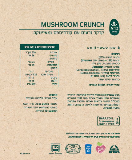 שילוב מאוזן של פטריות מרפא, עם תערובת עשירה של זרעים נבחרים וכוסמת מונבטת היוצרים יחד קרקר פריך, בתיבול עדין שמאפשר לחומרי הגלם לדבר בעד עצמם.
