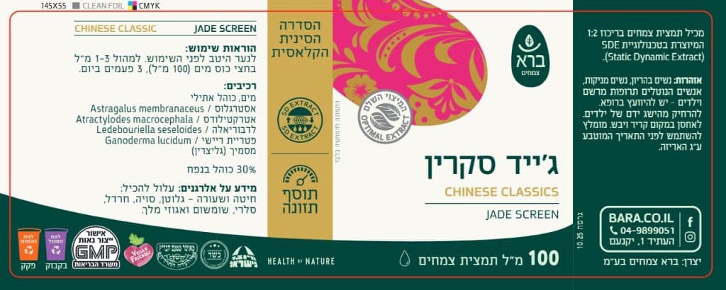 הפורמולה Yu Ping Feng Sanעליה מבוססת הפורמולה ג'ייד סקרין ידועה על פי הרפואה הסינית המסורתית בפעילותה התומכת בצ'י המגן – Wei Qi, האנרגיה המגינה של הגוף. 3 הצמחים בפורמולה פועלים בשילוב על מנת לתמוך בפעילותו של הצ'י המגן.